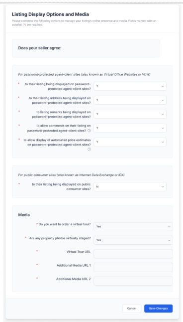 If a seller chooses not to display their standard listing outside of the MLS via a VOW feed, then answering “No” to the VOW display question will hide all remaining fields and the standard listing will not display anywhere online outside of the MLS. The IDX display will default to No.