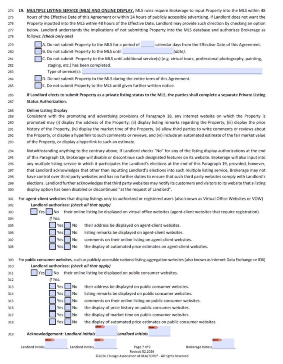 The existing paragraph in the listing agreement for Multiple Listing Service (MLS) has been updated to Multiple Listing Service (MLS) and Online Display. A new section titled Online Listing Display discusses the choices a seller has regarding how their listing will display online outside of the MLS. Additionally, this paragraph has important language for the brokerage, which states that other than inputting the seller’s choices correctly into the MLS, the seller acknowledges that the brokerage has no control over third-party websites and has no further obligation to ensure those third-party websites comply with the seller’s direction. MRED holds ultimate responsibility in ensuring its web partners display MRED listing data correctly and in accordance with their rules.
